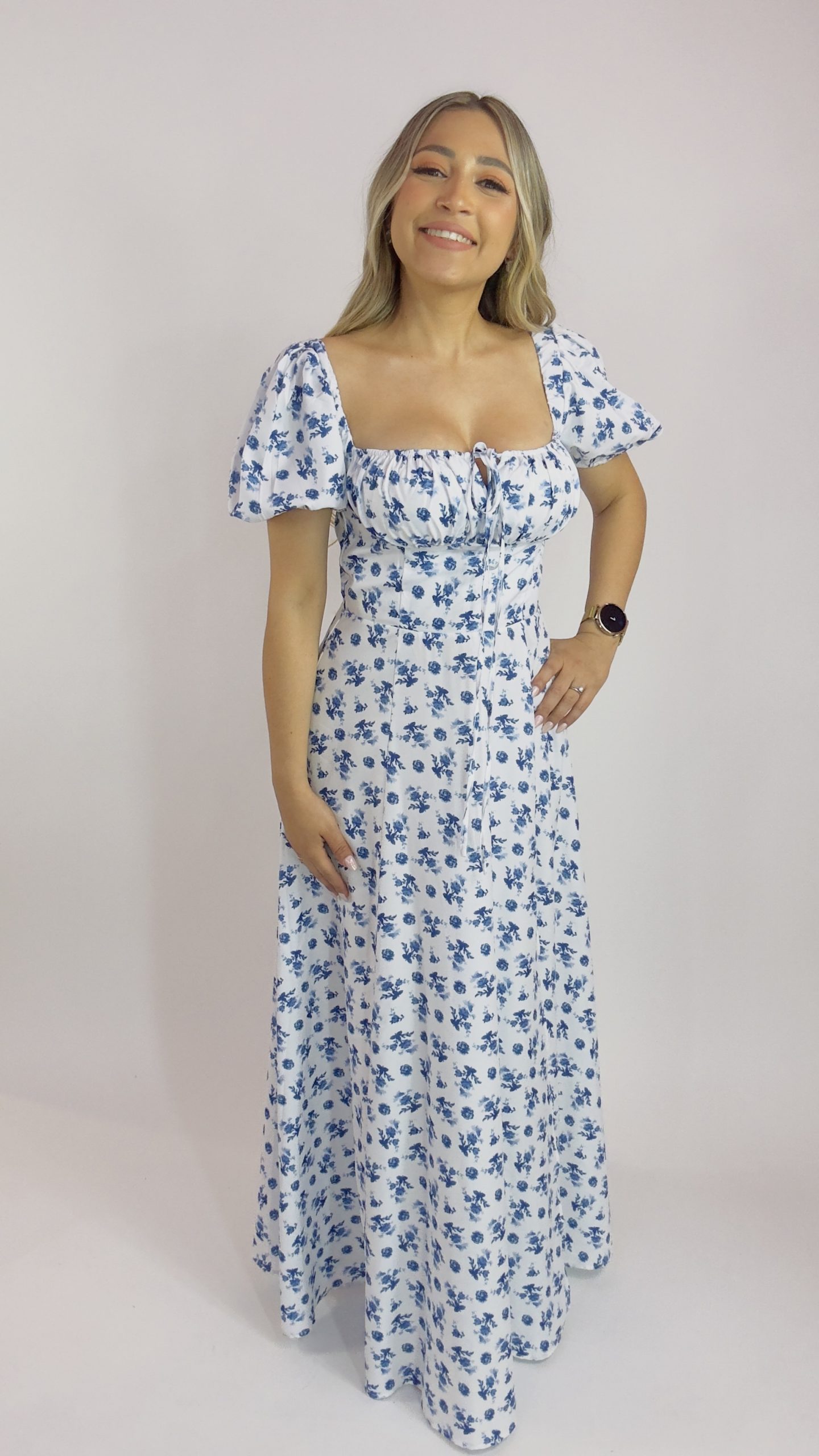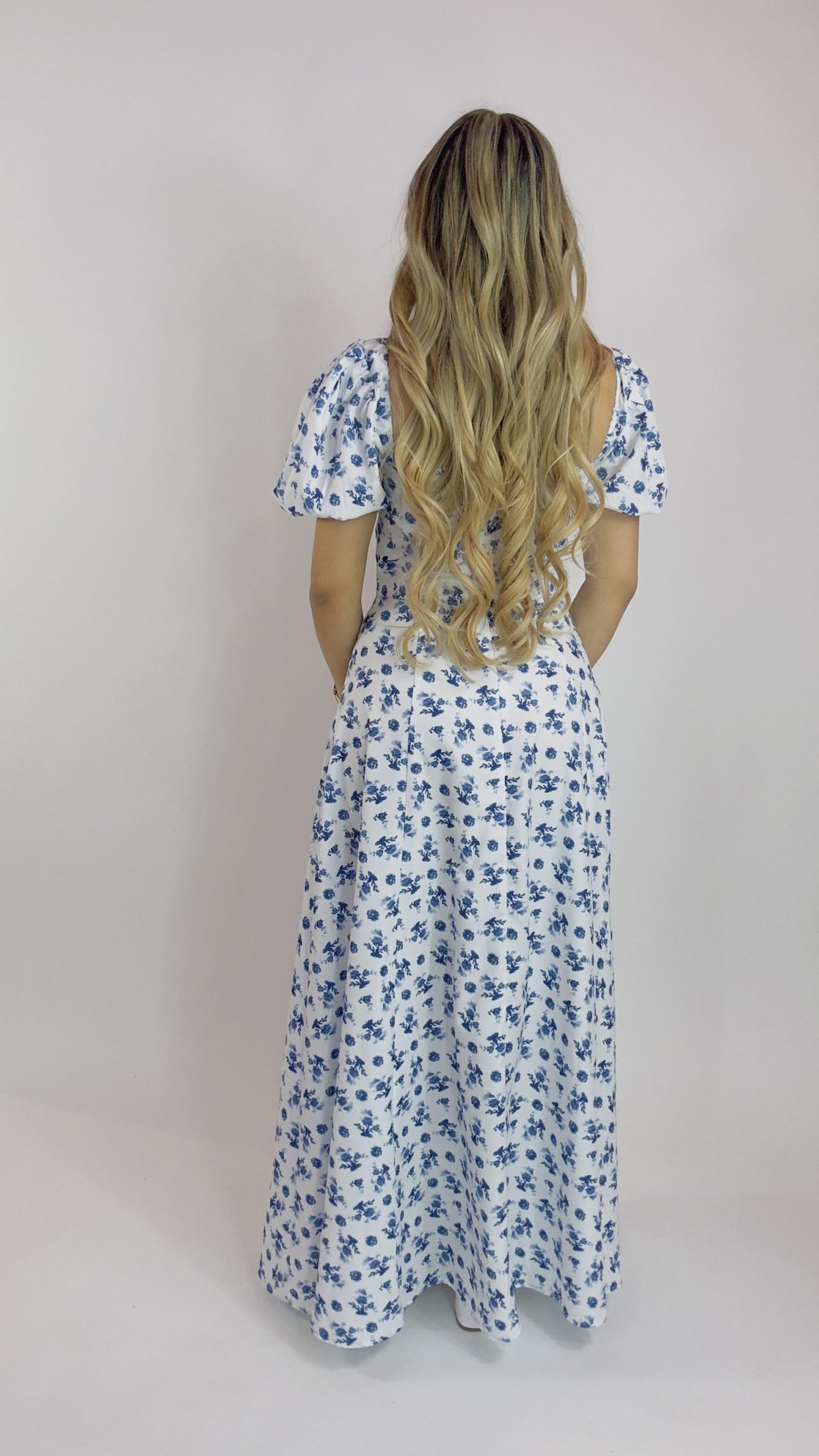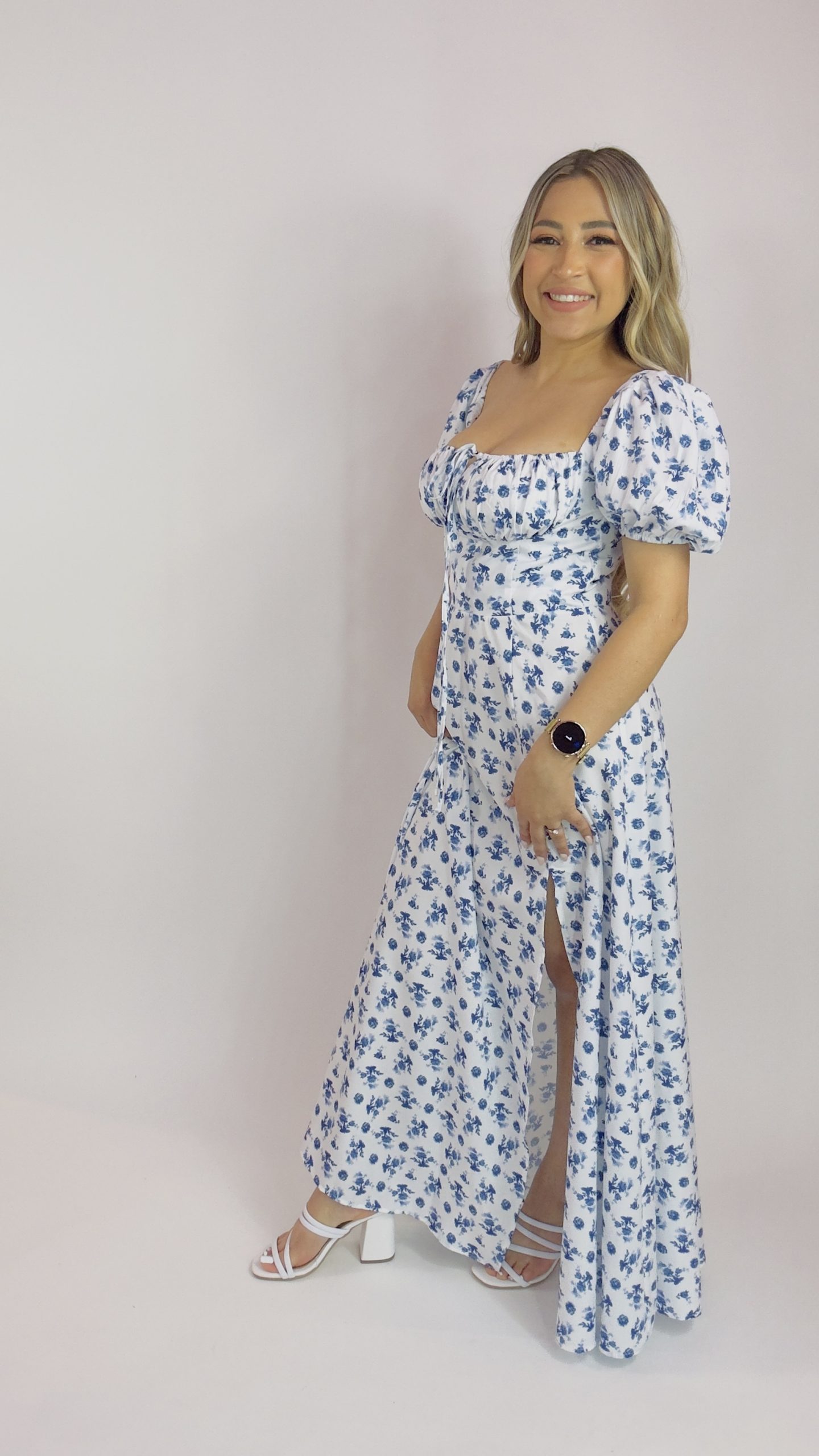 Vestido bohemio con estampado floral y abertura / Blanco con flores azules